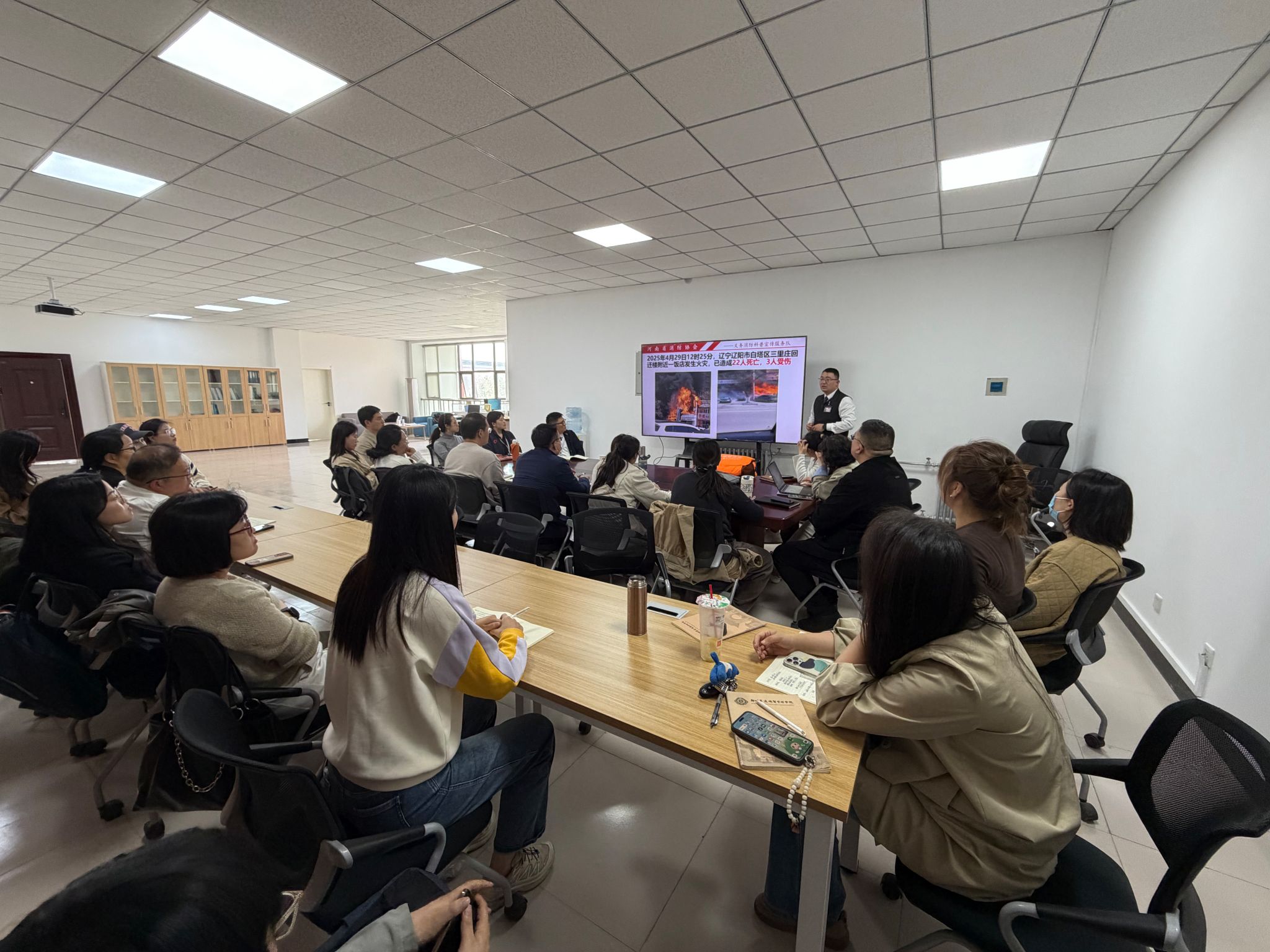 为进一步提升教职工的消防安全意识和自防自救能力,4月9日下午,创新创业教育学院在学苑会馆四楼401办公室组织全院教职工开展了消防安全培训会。我院特邀请河南省消防协会义务消防科普宣传服务队李林峰教员,为教职工讲授消防安全知识。院长王铮及全院教职工参会。